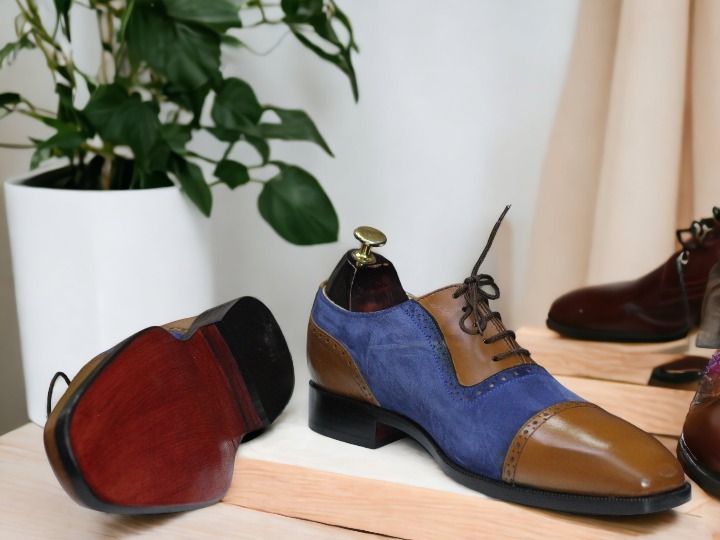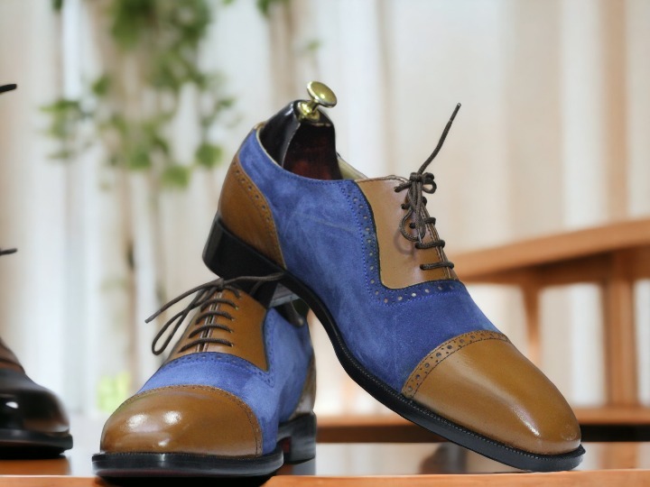 Handmade Blue & Brown Denim Leather , Cap Toe Lace Up Dress Shoes