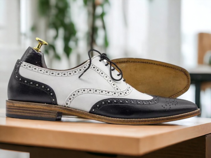 Handmade White & Black Wing Tip Brogue Leather Dress Shoes