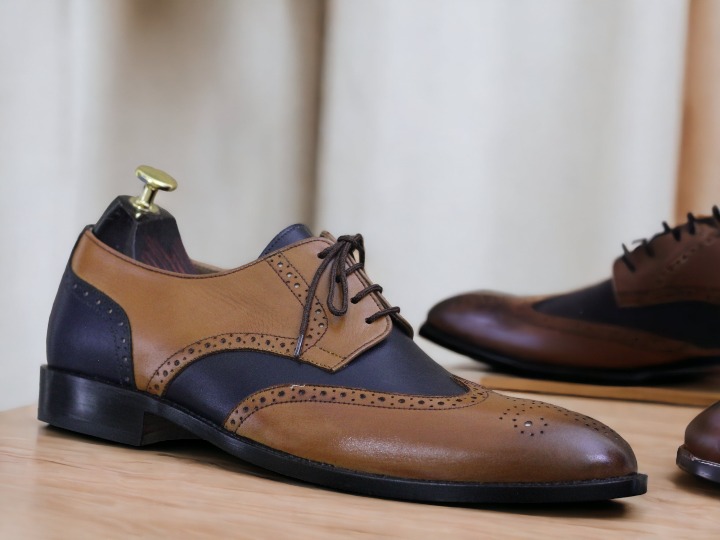 Handmade Blue & Brown Leather, Lace Up Wing Tip Brogue , Dress Shoes