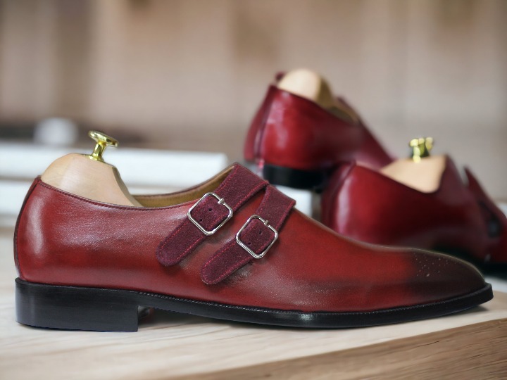 Handmade Men's Burgundy Double Buckle Leather Suede Shoes, Loafer Shoes