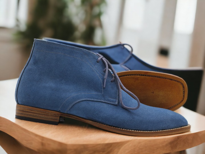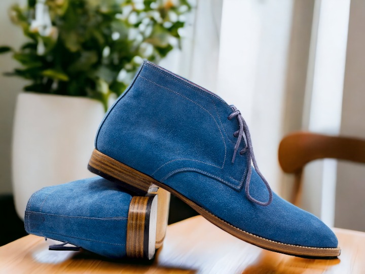 Men's Handmade Ankle High Blue Suede Leather Lace Up Boot, Fashion Boot