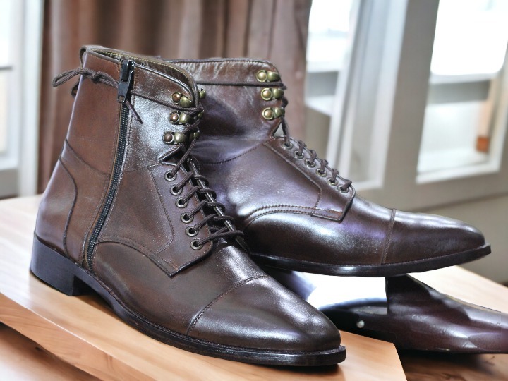 Men's Handmade Chocolate Brown Side Zipper Lace Up Boot, Fashion Boot