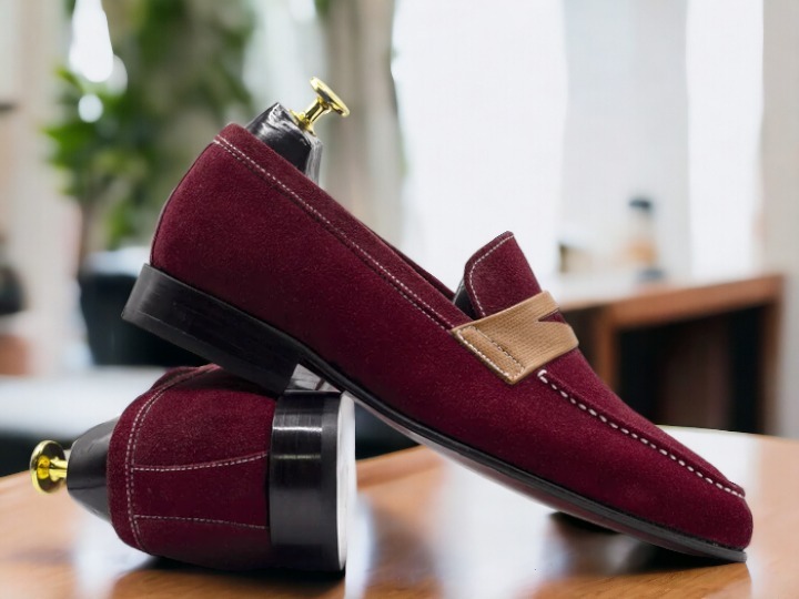 Handmade Men's Suede Burgundy penny Leather Loafer Shoes