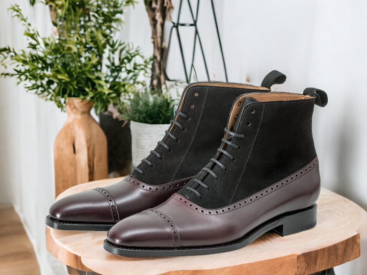 Handmade Men's Two tone Laceup Leather & Suede Quarter Ankle Boot