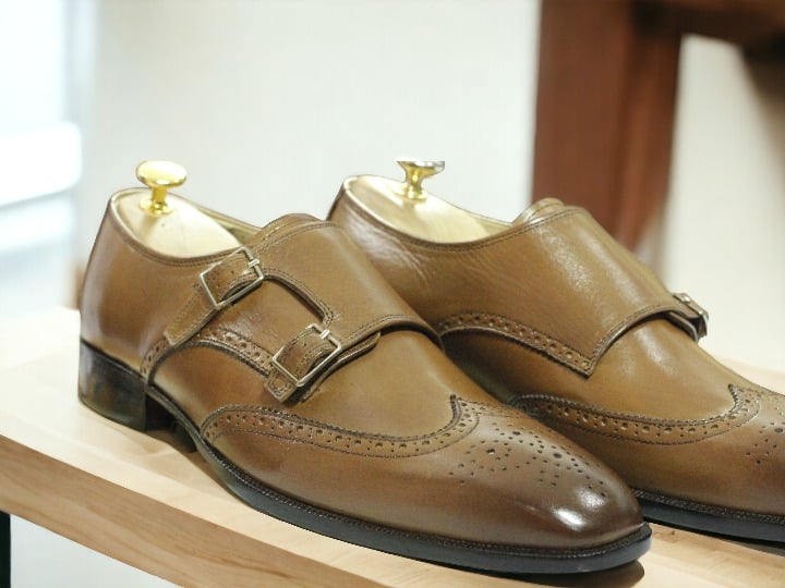 Handmade Men's Two Buckle Leather Wing tip Dress Shoes