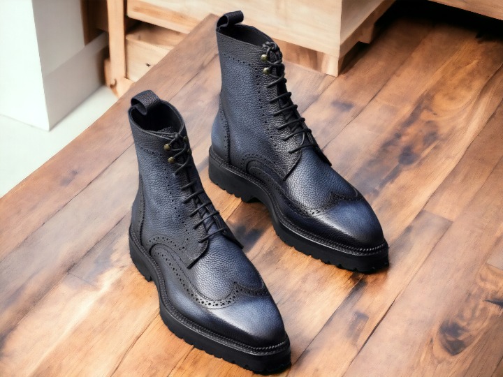 Handmade Men's Blue Leather Lace up Wing tip Ankle Boot