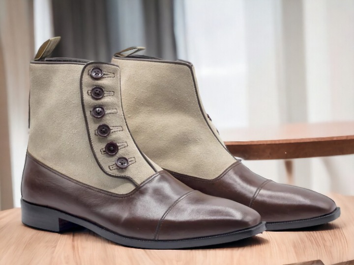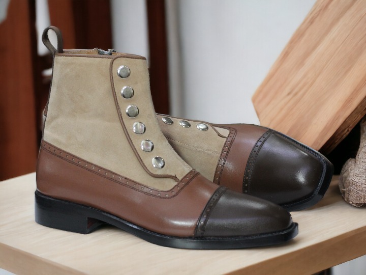 Handmade Men's Two tone Leather & Suede CapToe Button Ankle Boot