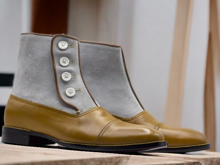 Handmade Men's Two tone Leather & Suede CapToe Button Ankle Boot