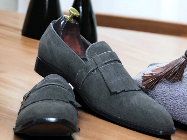 Handmade Men's Gray Suede Monk Fringe Shoes