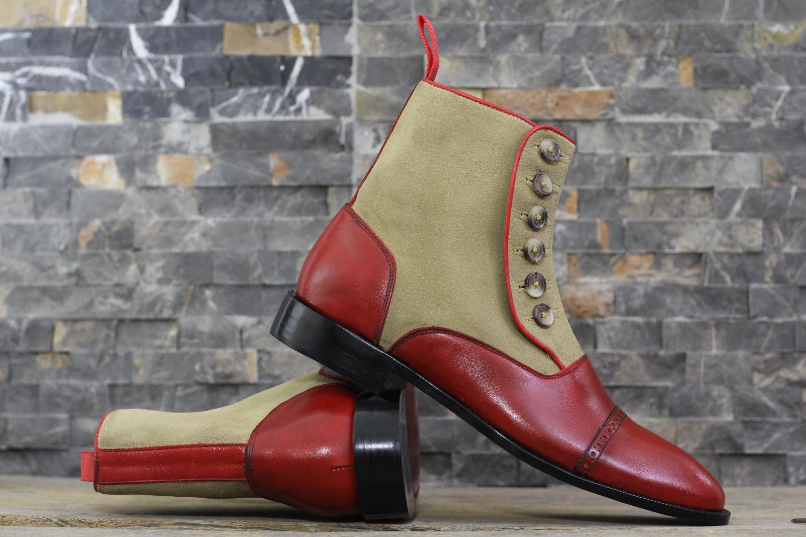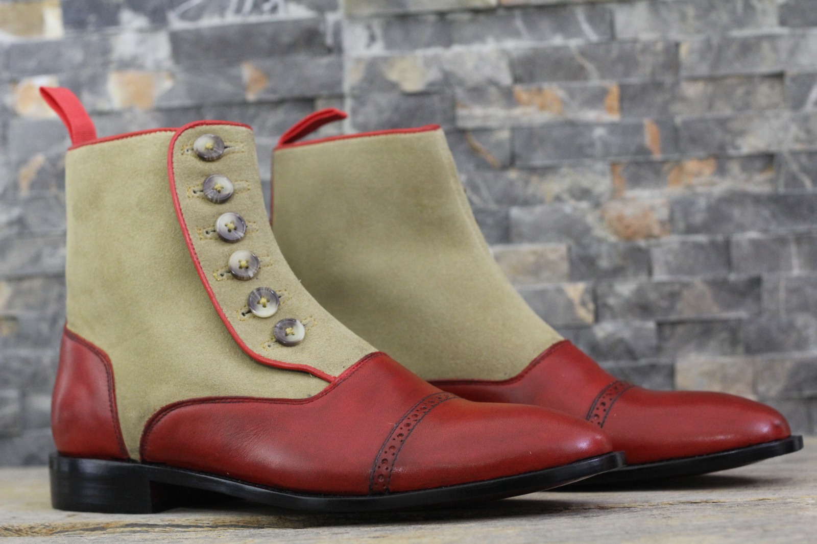 Handmade Men's Two tone Leather & Suede Button CapToe Ankle Boot