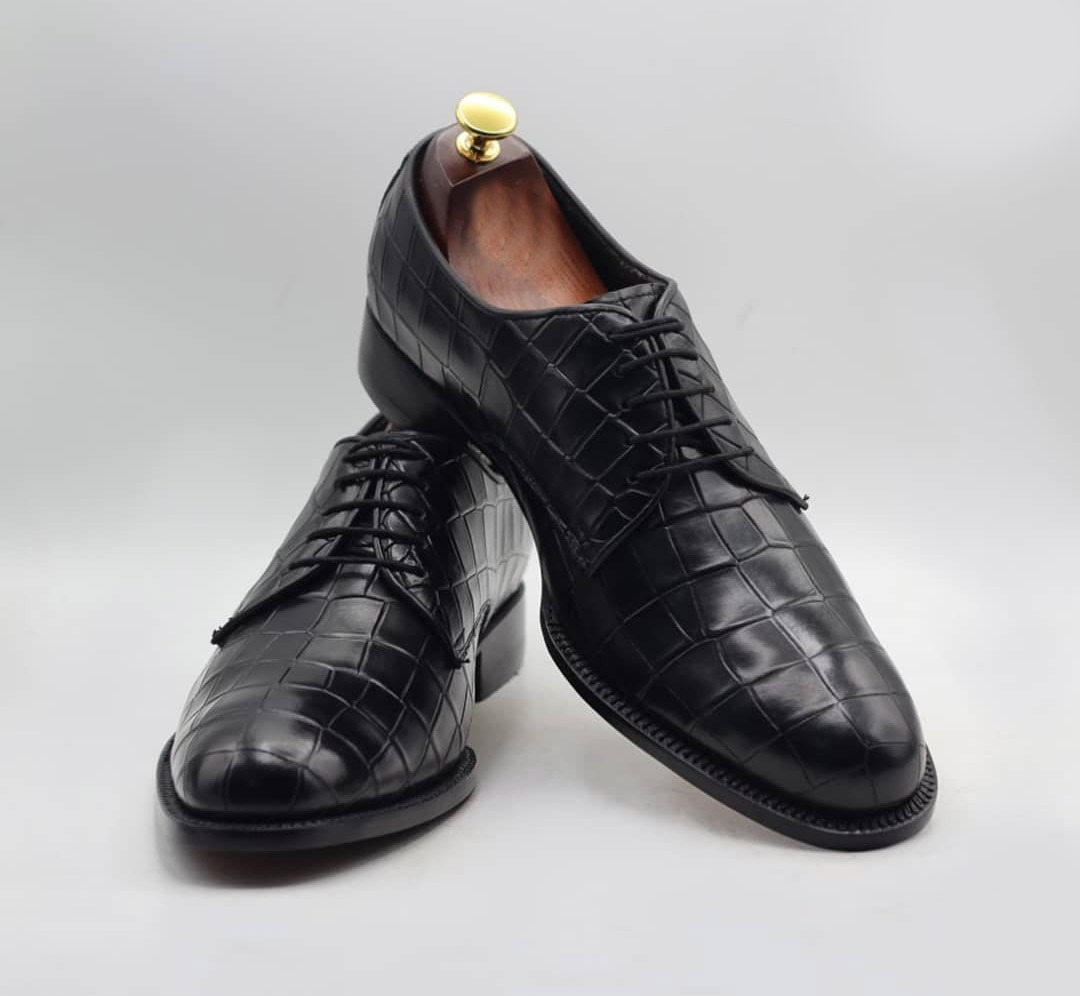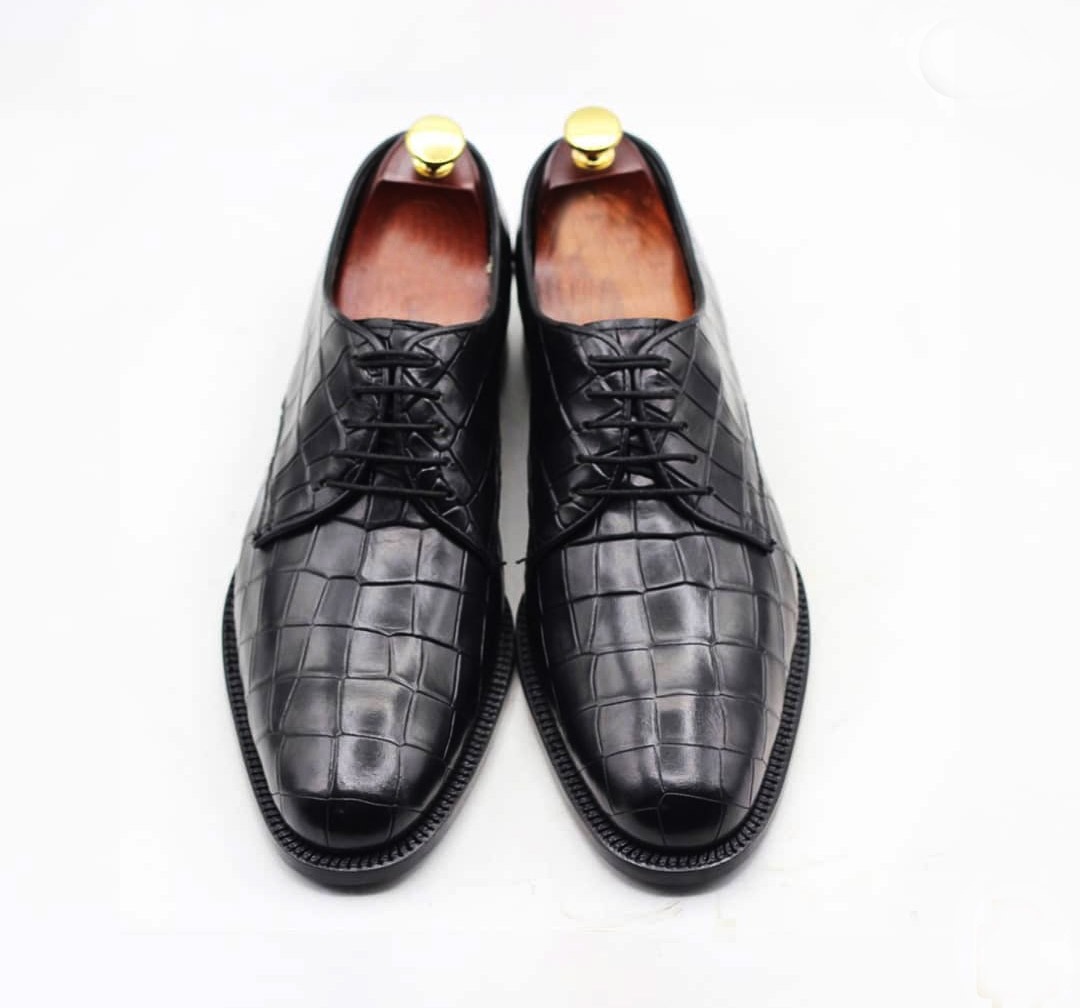 Handmade Men's Black Alligator Print Laceup Dress Shoes