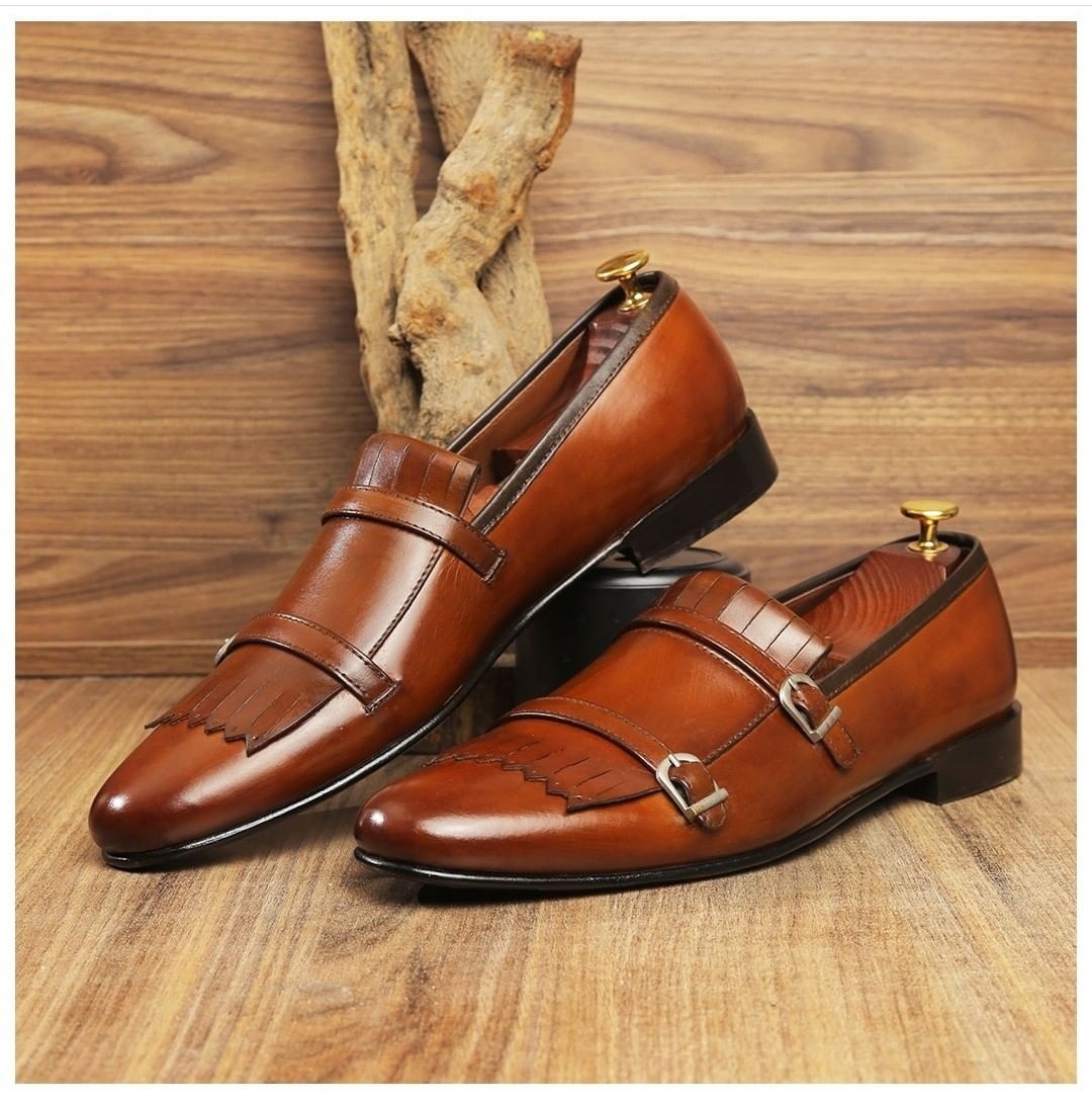 Handmade Men's Brown Leather Double Buckle Fringe Shoes