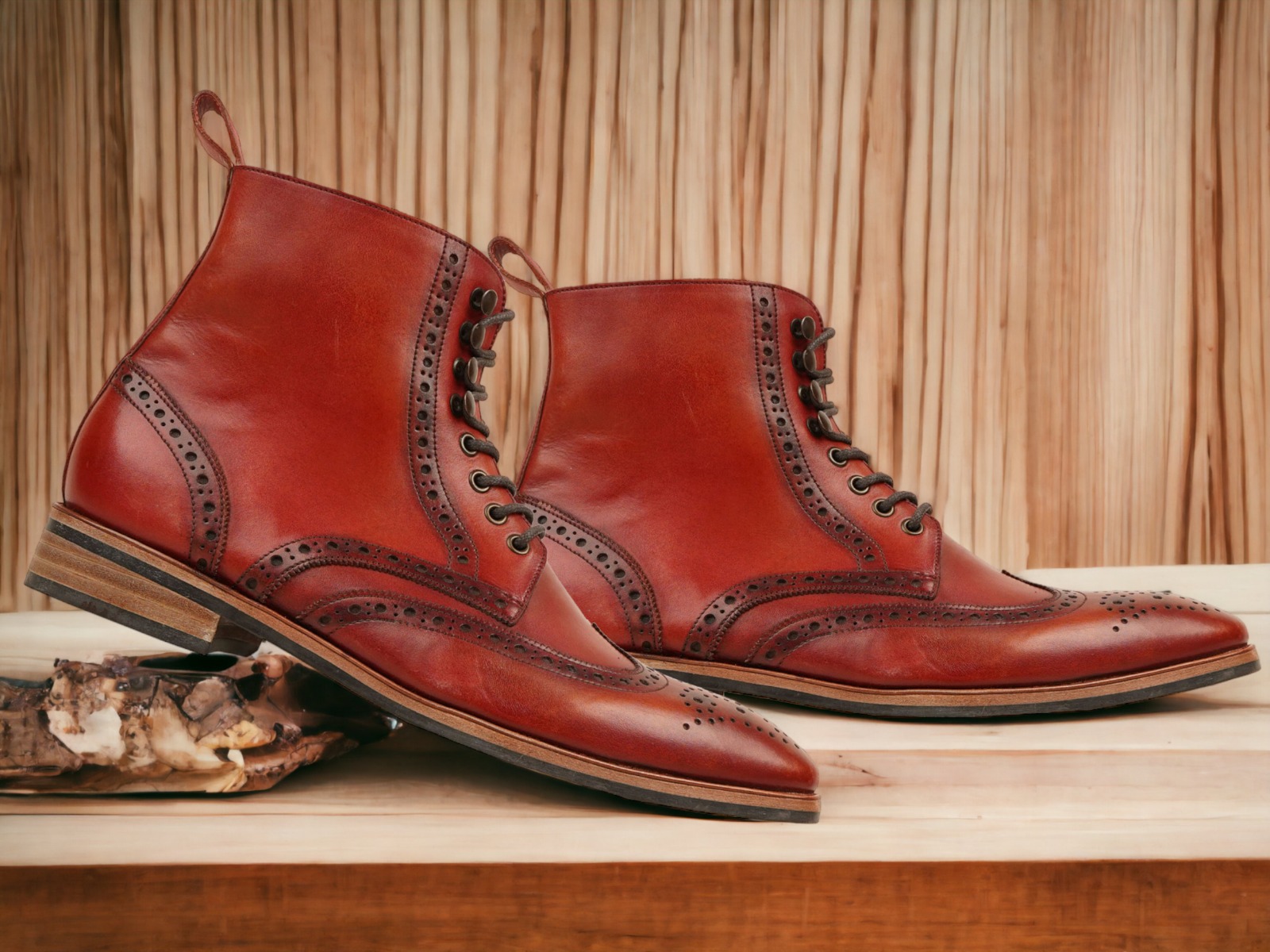 Handpainted Red Leather Lace up Wing Tip Brogue Boot Men's