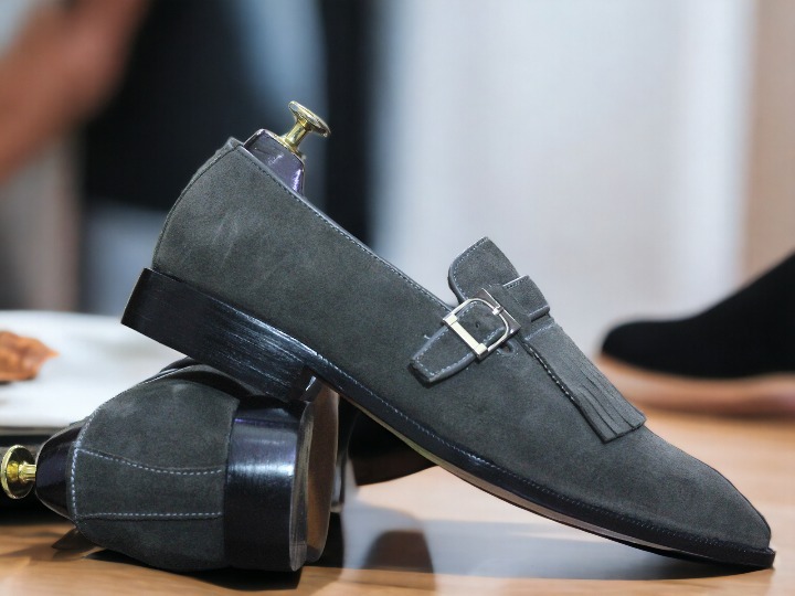 Fringe Handmade Gray Suede Singal Monk Buckle Fringe Formal Men's Shoes