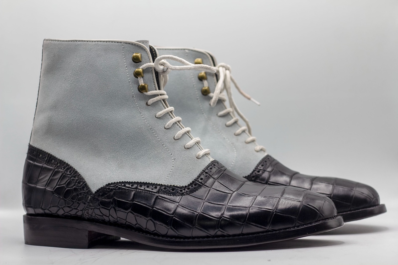 Handpainted Men's Two Tone Alligator Print Leather & Suede Lace Up Ankle Boots
