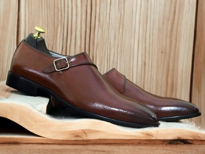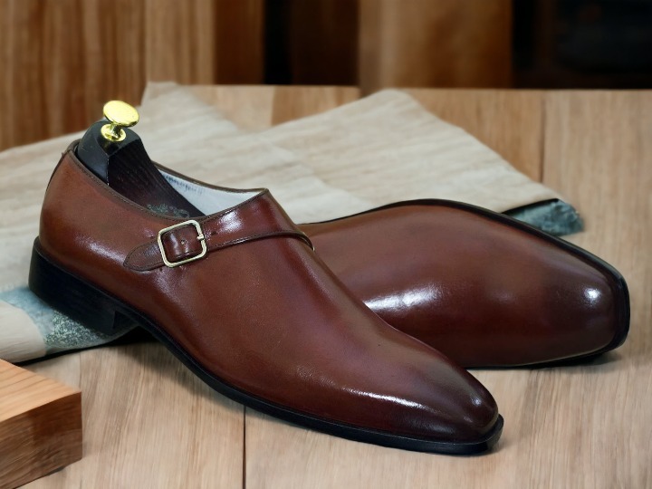 Handmade Men's Brown Singal Monk Buckle Leather Dress Shoes