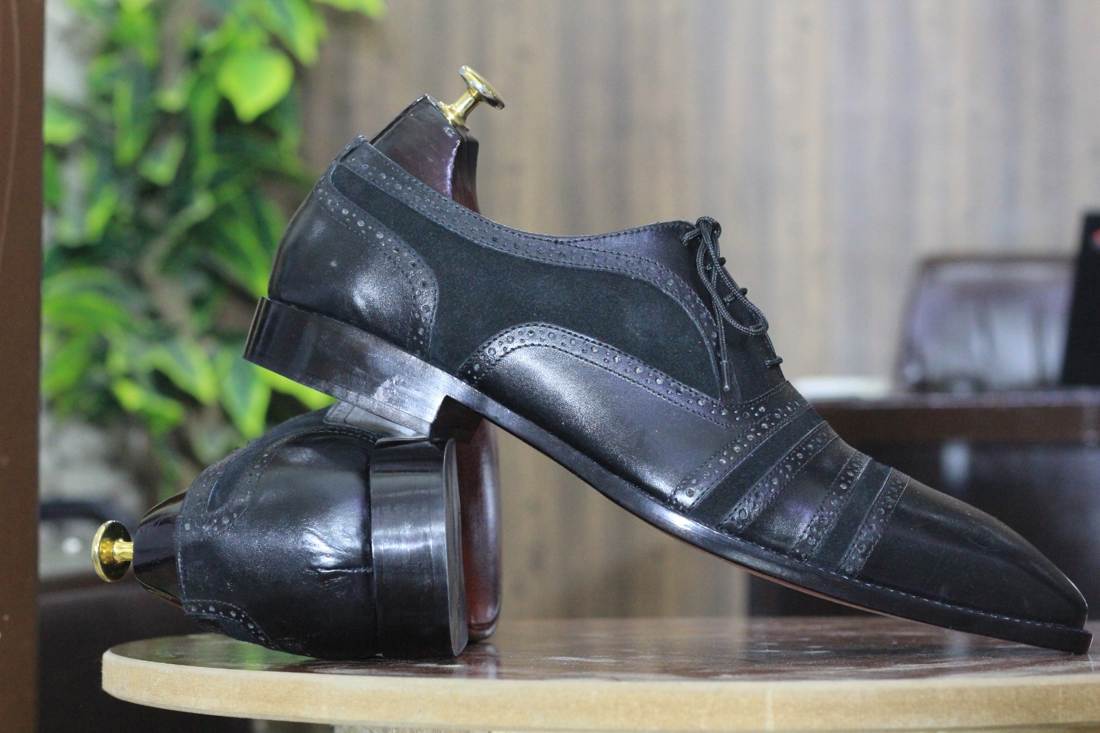 Handmade Men's Black Leather & Suede Lace Up Cap Toe Fashion Shoes