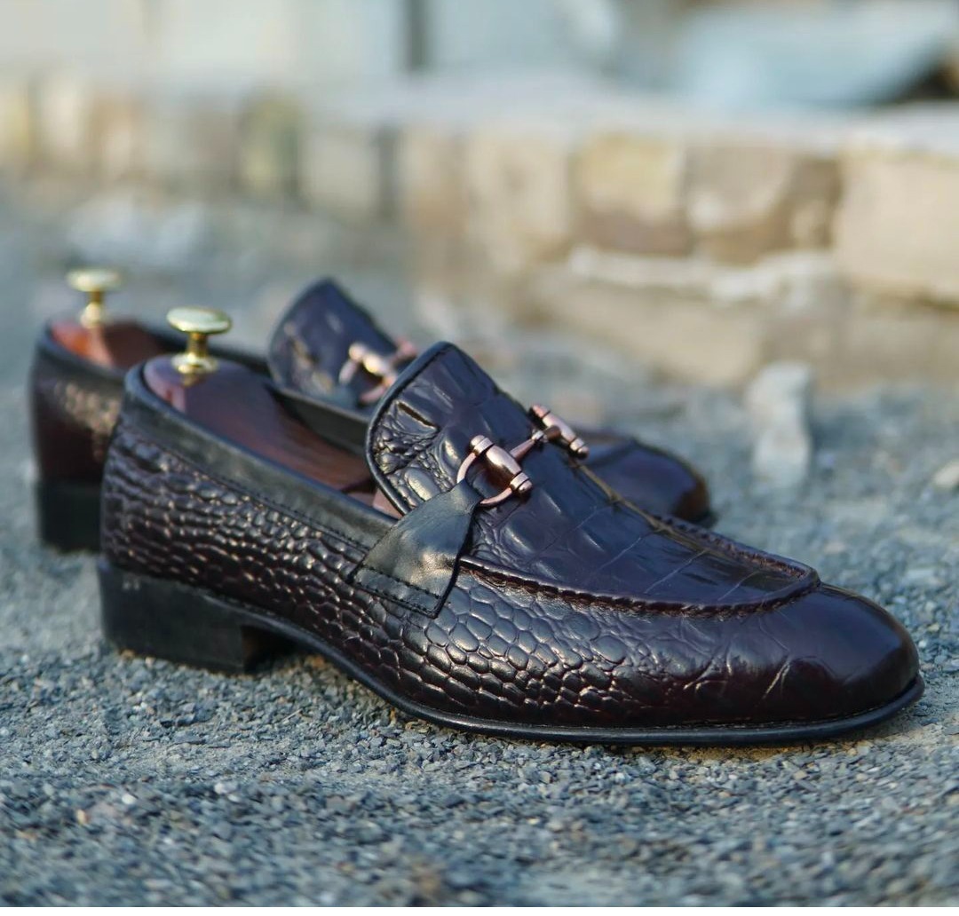 Black Men's Alligator Print Leather Horse Bit Handmade Loafer Shoes