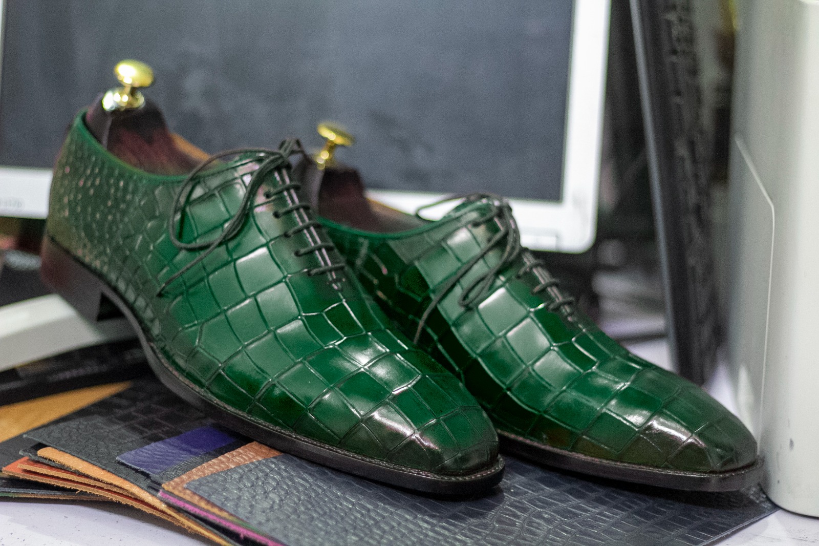 Men's Green Alligator Print Leather Lace Up Fashion Handmade Office Shoes
