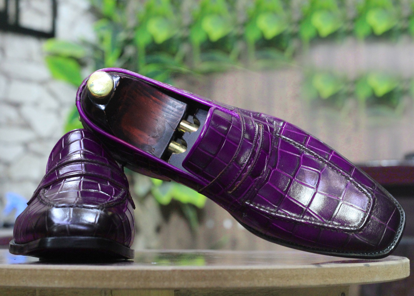 Handmade Men's Purple Alligator Print Leather Penny Loafer Shoes