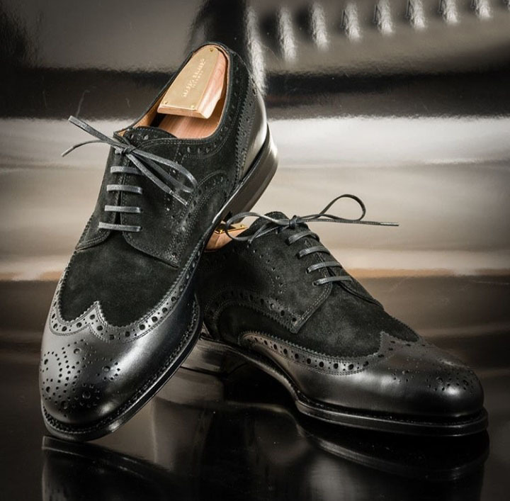 Handmade Men's Black Leather Lace Up Wing Tip Leather & Suede Dress Shoes