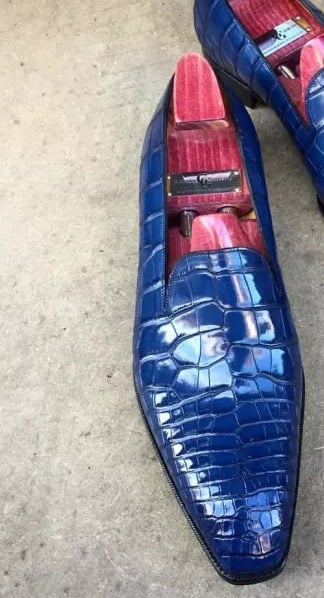 Handmade Men's Blue Alligator Print Leather Loafer Shoes