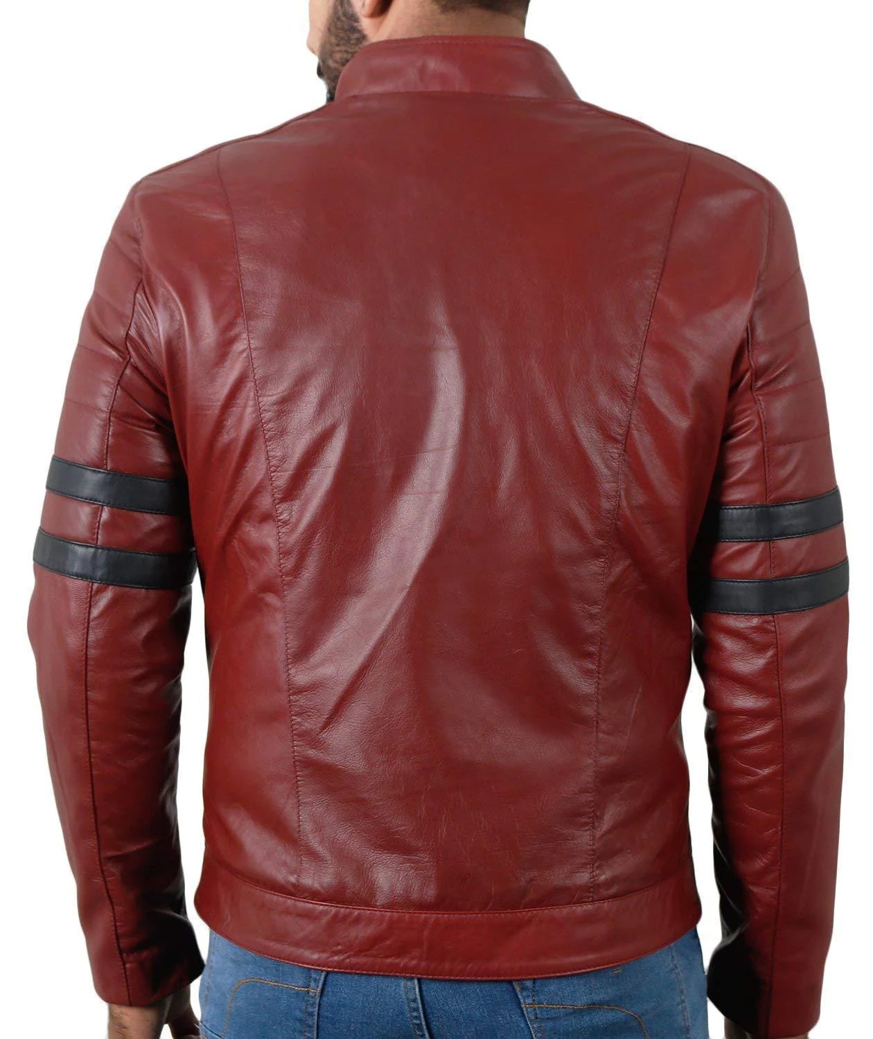 Men's Fashion Maroon Leather Zipper Pocket Navy Blue Stripped Biker Handmade Jacket