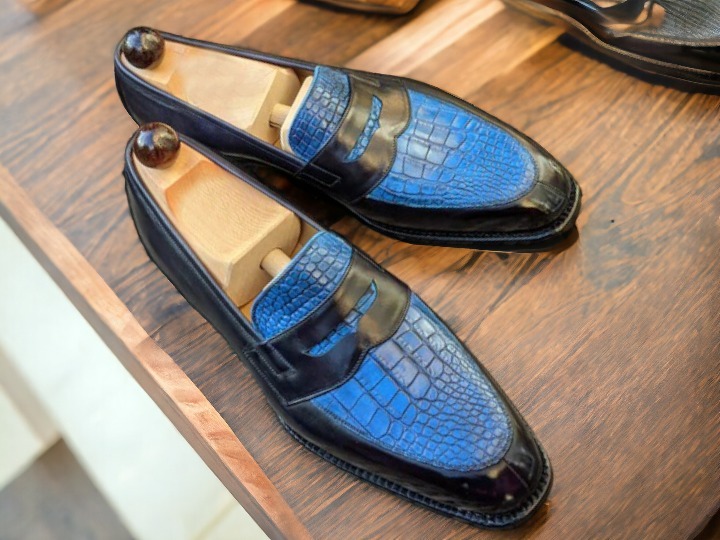 Men's Alligator Texture & Leather Shoes, Handmade Slip On Penny Loafer Formal Shoes