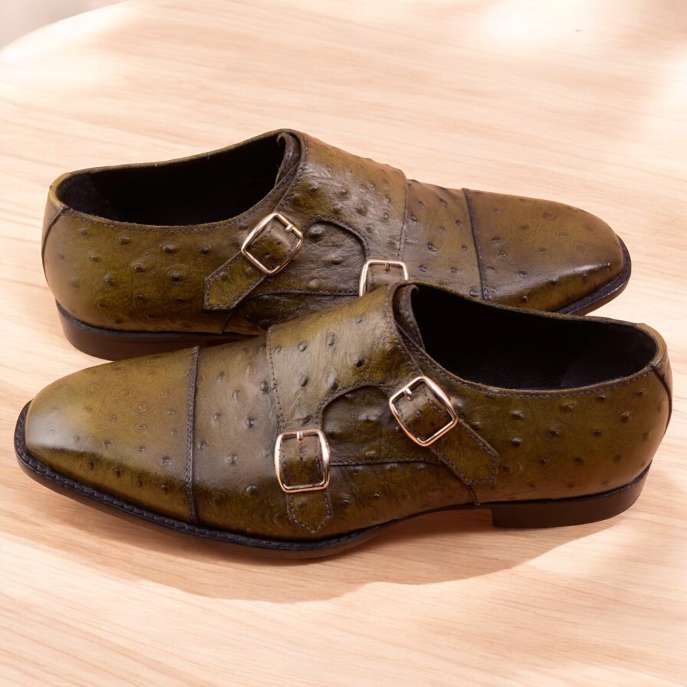 Handmade Double Monk-Straps designer shoes for men, embellished Olive Green leather,