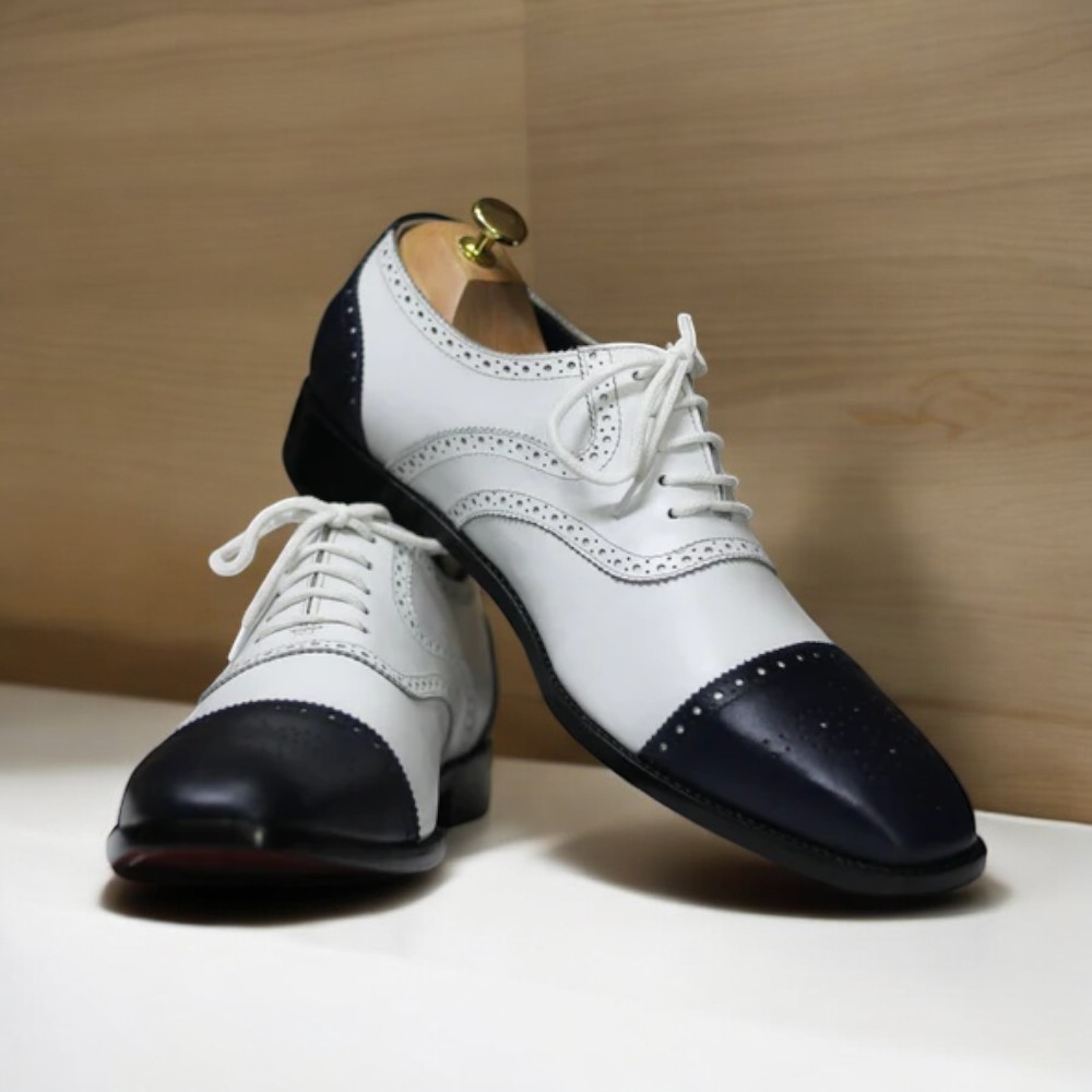 Handmade Cap Toe Brogue Black & White Goodyear Welted Lace Up Shoes For Men's